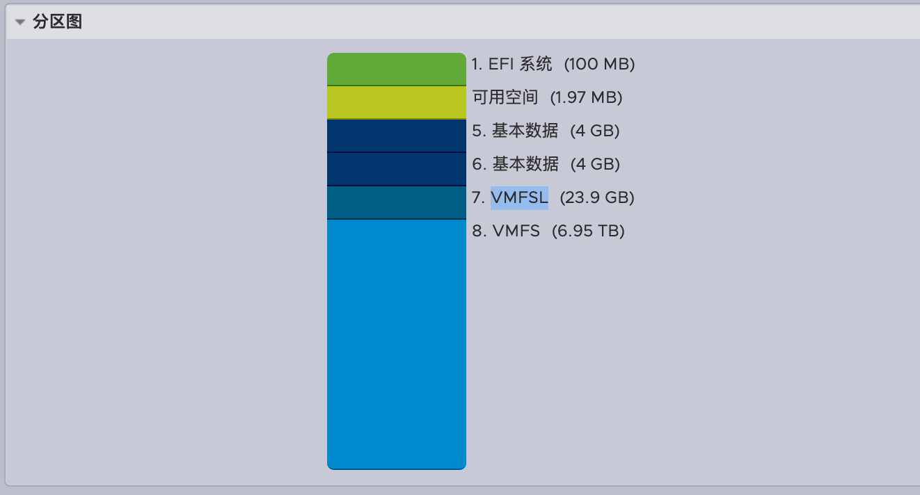 ESXi 从 7.0 开始,默认会在系统盘分配 120GB 左右的空间预留为交换分区供未来的版本升级用,这个分区的大小可以在部署 ESXi 的时候通过参数调整,部署完了就没法动了。