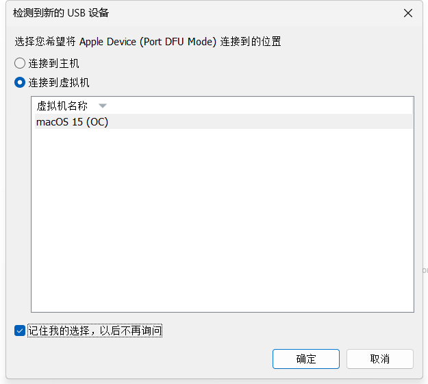 打开 Apple Configurator,Mac 断电插上 USB 线 (注意要插有闪电标志的接口),按住电源键通电,等待 VMware 提示有 DFU 可移动设备后松手并将其连接到虚拟机。