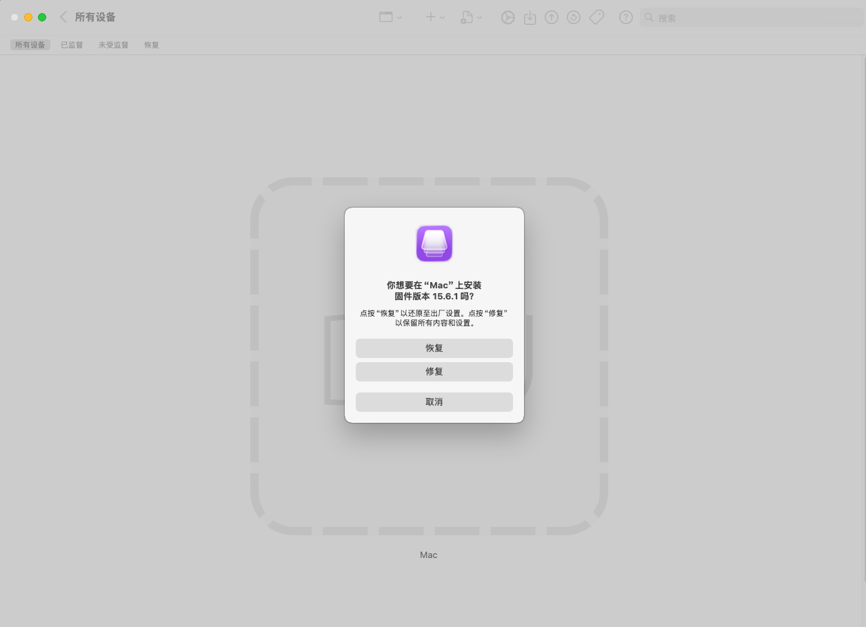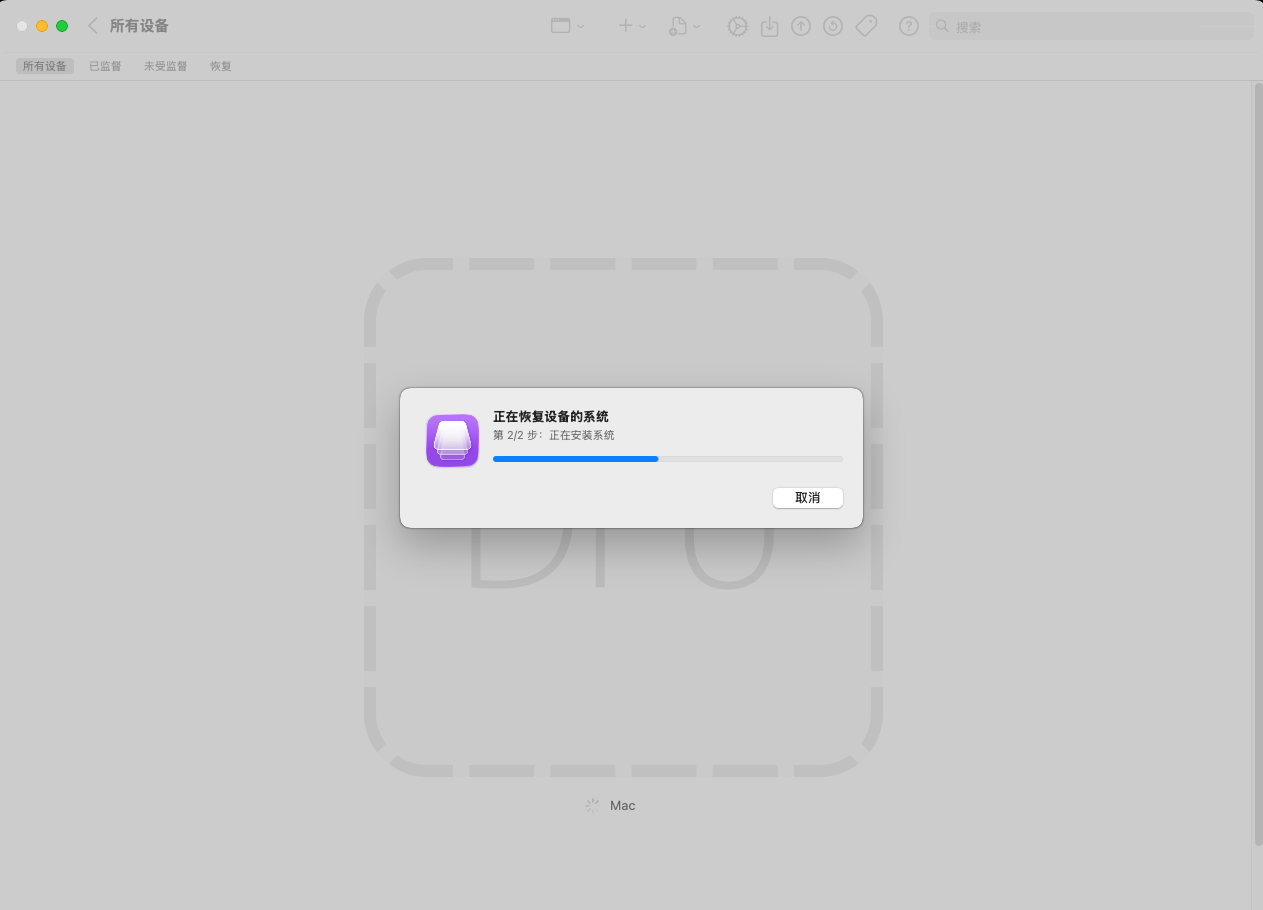 此时 Apple Configurator 会显示 DFU 设备,将下载的固件拖入并点击恢复。