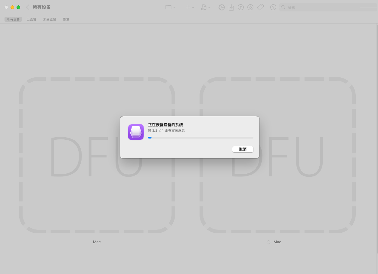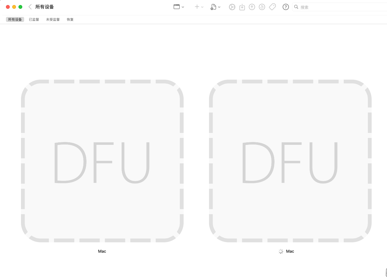 第一次重启连接到虚拟机后 Apple Configurator 会出现两个 DFU 设备如下。