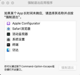 如果不操作的话会一直卡住,怀疑是兼容性问题,此时需要通过左上角苹果图标强退 Apple Configurator